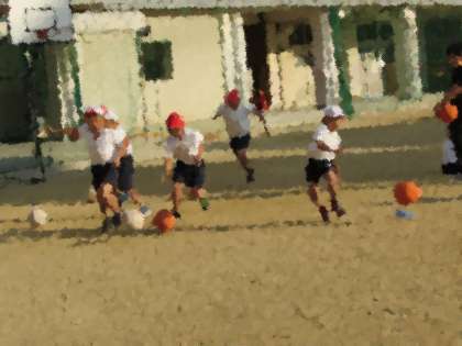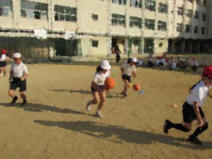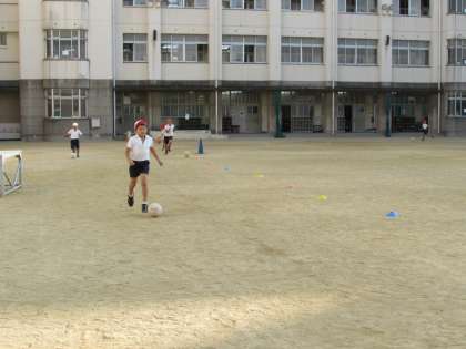 4年生の学習の様子をご紹介します。4年1組は、運動場でランニングです。バスケットボールをドリブルしながら、サッカーボールをドリブルしながら、さて、だれが一番速いでしょう。