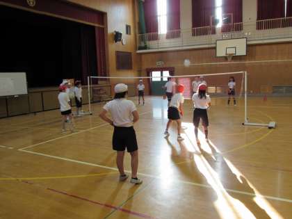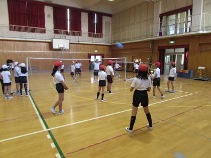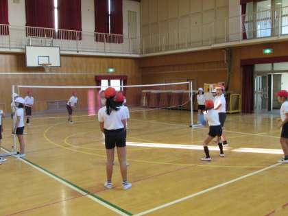 4年2組は、体育館で、ソフトバレーボールに取り組んでいます。白熱したゲームが続いています。