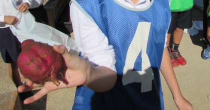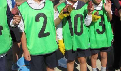 本日の2時間目、わかばタイムの時間に、わかば学級の子どもたちが学習園に行き、育てていたサツマイモを掘りました。土の中から、おいもが出てくる度に、子どもたちは大きな声を上げ、喜びました。