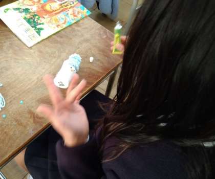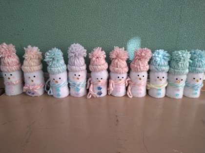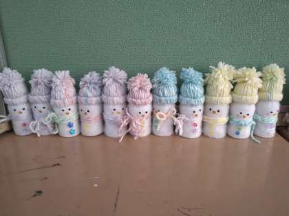空き容器と毛糸をつかって雪だるまを作りました。