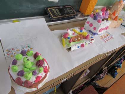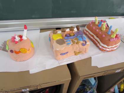 2年生の学習の様子をご紹介します。2年生が図画工作「ケーキやさん」に取り組んでいます。箱やプリンの容器などを心材として、そこに紙粘土を貼り、おいしそうなケーキを作っています。