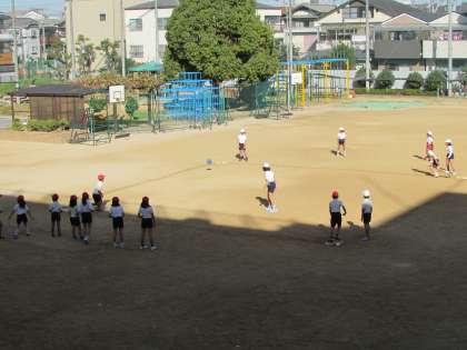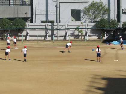 3年生の体育の様子をご紹介します。3年生が運動場で、キックベースをしています。