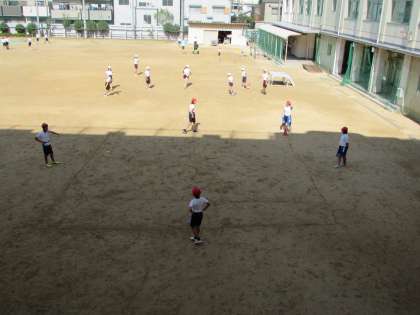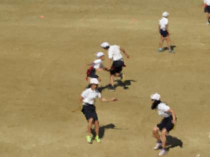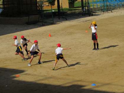 6年生の学習の様子をご紹介します。6年生が体育で、フラッグフットボールに取り組んでいます。フラッグフットボールは、アメリカンフットボールで行われる「タックル」に 代わり、プレーヤーの腰の左右につけた「フラッグ」を取ることに置き換えるスポーツです。今日はパスの仕方も練習しました。