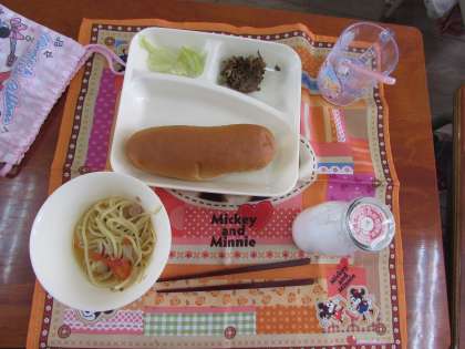 本日の給食の献立をご紹介します。本日の献立は、黒糖パン、牛肉のカレー風味焼き、トマトのスープスパゲッティ、キャベツときゅうりのピクルス、牛乳でした。