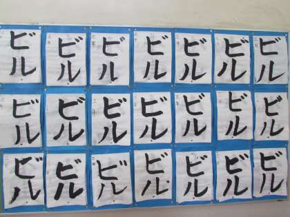 3年生の書写の作品をご紹介します。3年生は毛筆書写で、「ビル」と書きました。カタカナのバランスを考えて、書きました。