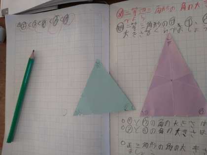 二等辺三角形と正三角形の角の大きさについて学習しました。