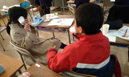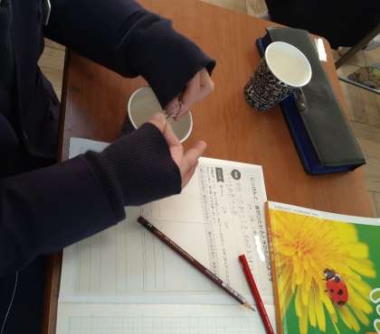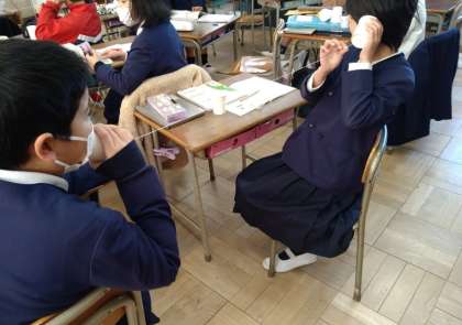 糸電話で話しているときに、糸に指でそっとふれたときと、指で糸をつまんだときどのように感じるかを実験しました。