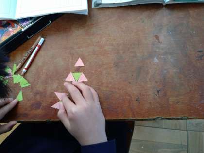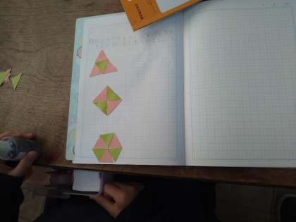 二等辺三角形や正三角形をしきつめいろいろなもようをつくりました。