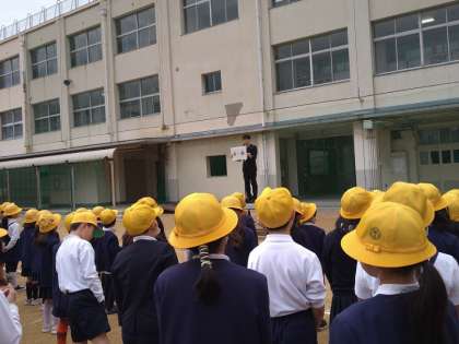 全校朝会のようす 校長先生のお話 「春一番」についてのお話と本校卒業生のベリーグッドマンの紹介でした。