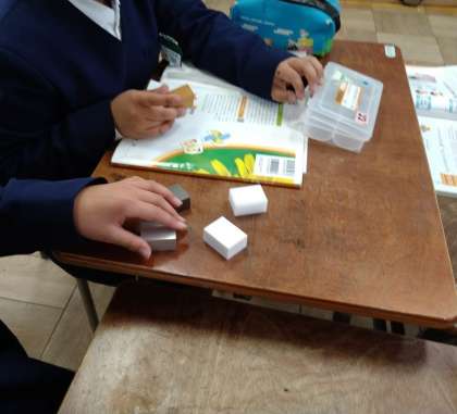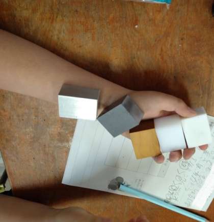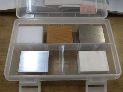 同じ体積の鉄、アルミニウム、ゴム、木、プラスチックを重たく感じた順にならべてみました。次回の実験で、実際に重さをはかって確かめます。
