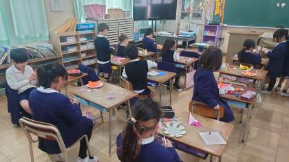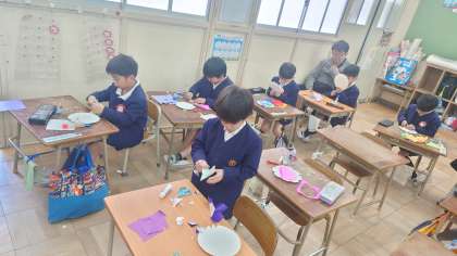 紙皿を土台にして、折り紙の花びらを重ねていきました。一人ひとり違う「夢の花」を飾って、6年生の卒業をお祝いします。
