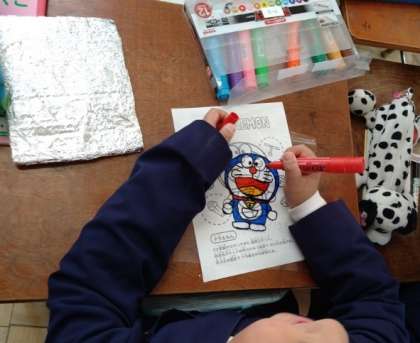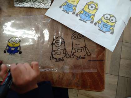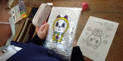 段ボールにアルミホイルを貼り、ビニールにすきな絵をかいています。