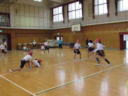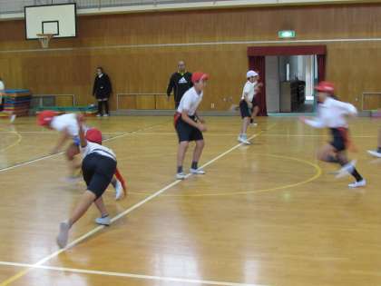 6年生の学習の様子をご紹介します。1組は体育館で、体育の学習です。フラッグフットボールの練習をしています。コートの真ん中に立った3人のそばを、4人の子どもたちが駆け抜けていきます。腰に付けたフラッグを取られなければOKです。