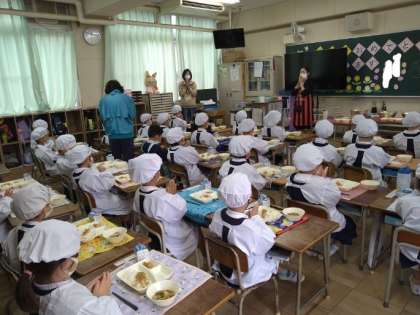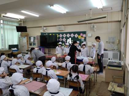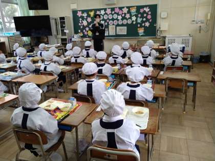 1年生にとって、初めての給食です。6年生が給食室から教室まで運び、配膳までしてくれました。