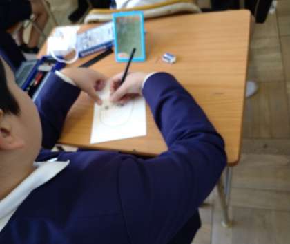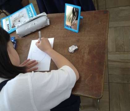鏡をみて、自分の顔を描いています。