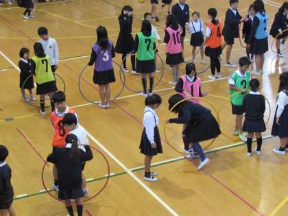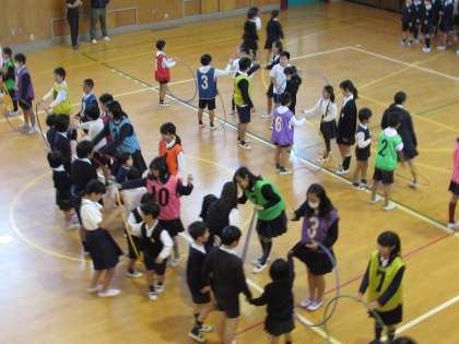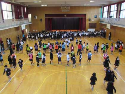 木曜日の朝、児童集会の様子をご紹介します。本日は、「フラフープじゃんけん」です。各班のリーダーが講堂の真ん中に立ち、そのリーダーとじゃんけんをします。勝てばそのまま引き返せますが、負ければフラフープをくぐらなければなりません。5分間、白熱したじゃんけん勝負が続きました。