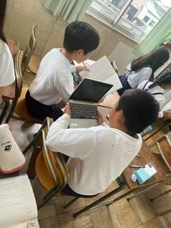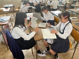 お互いの音読を動画で撮影し合って確認します。