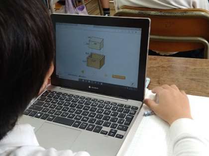 タブレットを使って、入れものに入るかさについて考えています。