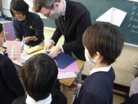 先生の話をよく聞いて、ドリルに漢字を書いています。