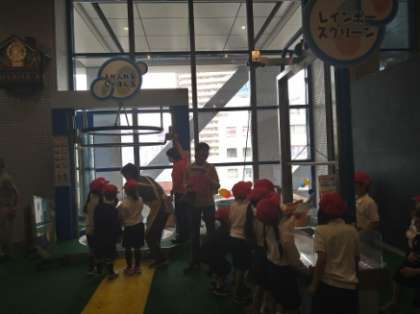 シャボン玉に入る列に並んでいます。 しっかり順番を守って待っています。