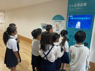 ガス洗浄装置の学習をしています。「水蒸気になるんやで。」と知っていることをつぶやく子もいました。
