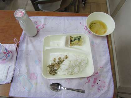 本日の給食の献立をご紹介します。本日の献立は、ご飯、千草焼き、すまし汁、ツナっ葉炒め、牛乳でした。