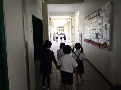 いよいよ学校探検のはじまりです。 2年生は、1年生を連れて学校内をまわります。