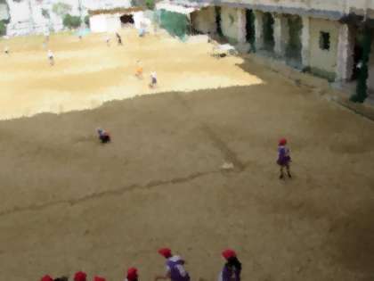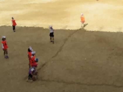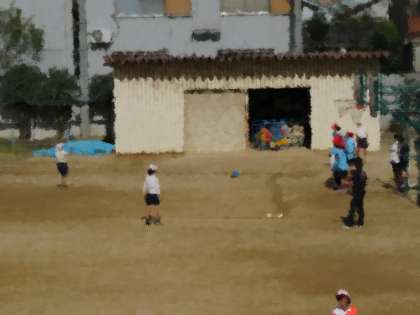 3年生が運動場で体育をしています。4つのチームに分かれ、キックベースをしています。