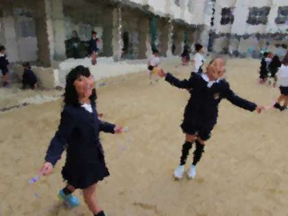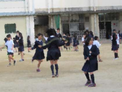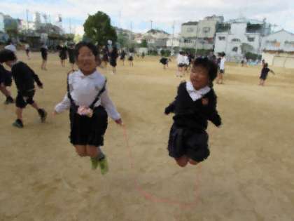 お昼休みになりました。大勢の子どもたちが運動場で遊んでいます。その中でも、縄跳びに取り組んでいる子が多いことに気づきます。低学年も高学年も、自分なりのめあてを持ち、楽しく跳んでいます。