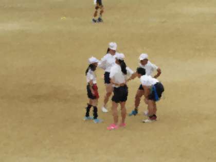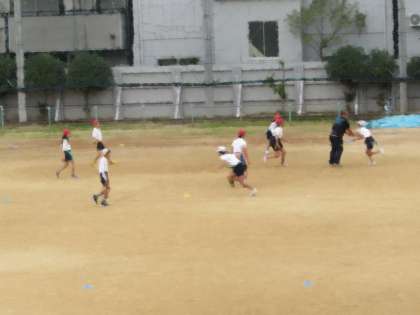 6年生が、運動場で体育をしています。初めに、準備運動としてなわとびに取り組んでいます。さすがに6年生、速く回し、続けて長く跳ぶことができています。
