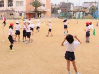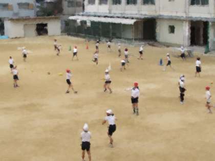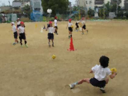 4年生の体育の学習の様子をご紹介します。4年生は運動場で、サッカーに取り組んでいます。まずは2人でペアを作り、パスの練習です。