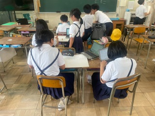 始めに、栽培に関するクイズを考えました。パソコンを使って話し合いながら取り組んでいます。