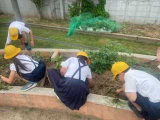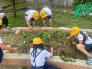 その後、学習園の整備をしました。みんなで雑草を抜いています。