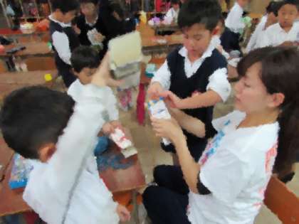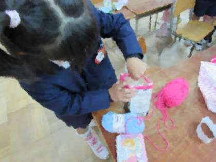 1年生が、牛乳パックを使ったマフラー作りに取り組んでいます。牛乳パックに切り込みを入れ、毛糸をひっかけながら編んでいきます。おもちゃのリリアンの編み方の要領です。