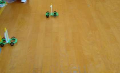 風の強さが変化すると、車の進む距離はどうなるのかを実験しています。