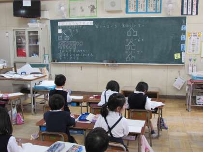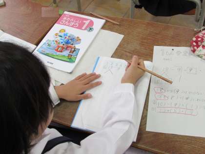 1年生の学習の様子をご紹介します。1年生が算数で、くり下がりのあるひき算に取り組んでいます。「12−7」で、一の位の2から7が引けないことから、12を10と2に分け、10から7を引く方法で計算しています。12を10と2に分けるとき、12の下に「さくらんぼ」を書いています。