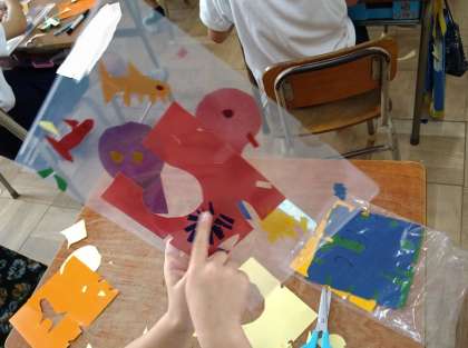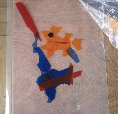 色の重なりを考えながら、クリアファイルにセロハンをつけていきます。