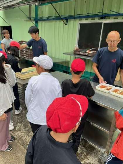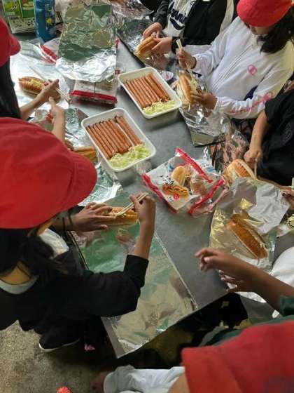 3日目も全員元気に朝の会からスタートしました。ハチ高原の朝の気温は20度、小雨が降っています。今日の朝食はカートンドッグです。宿舎の方の説明を聞いて、班で協力して準備をします。