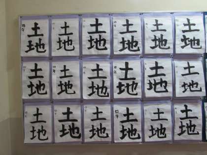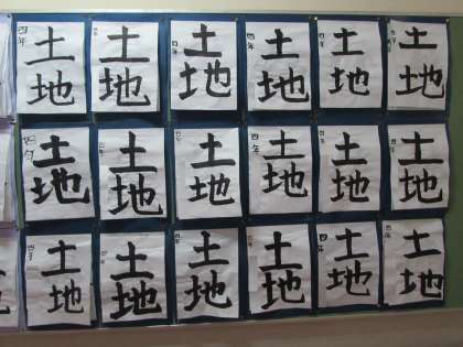 4年生の作品をご紹介します。4年生の書写の作品「土地」です。曲がりやはねを意識して、大きく力強く書きました。