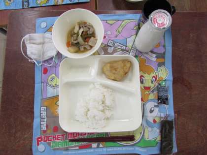 本日の給食の献立をご紹介します。本日の献立は、ご飯、まぐろのフライ、鶏肉と厚揚げの煮物、焼き海苔、牛乳でした。