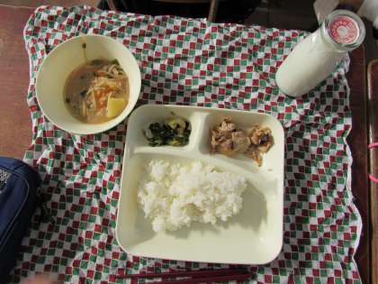 本日の給食の献立をご紹介します。本日の献立は、ご飯、豚肉のしょうが焼き、さつまいものみそ汁、菊菜とはくさいの胡麻和え、牛乳でした。