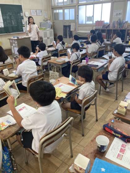 歯垢について学習しました。前歯についている歯垢を染め出して、歯をきちんと磨けているか確かめました。「はみがき名人カード」に赤く染まったところに色を塗りました。