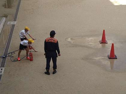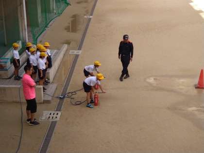 水消火器の体験では、「火事だ!」と大きな声を出すことができました。