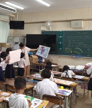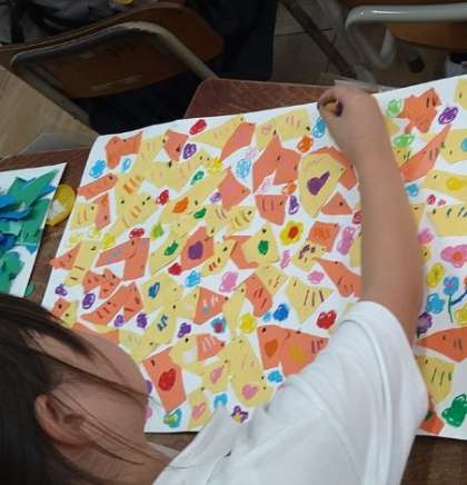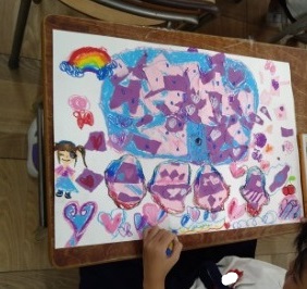 やぶいた画用紙をのりで貼り、クレパスで絵を描いて仕上げです。