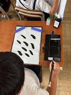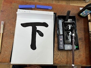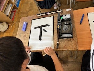 漢字の「下」を書くために、縦書き、横書き、点の練習をしました。「とんすうぴたっ」と言いながら、始筆、送筆、終筆を意識してゆっくり丁寧に筆を運びました。