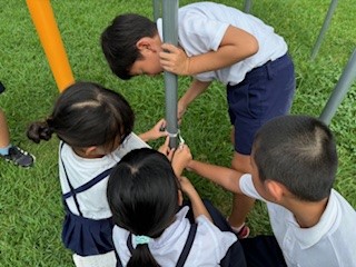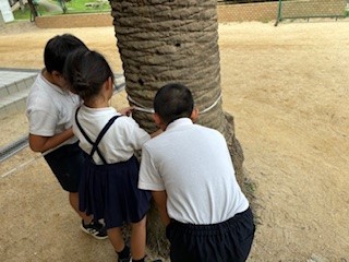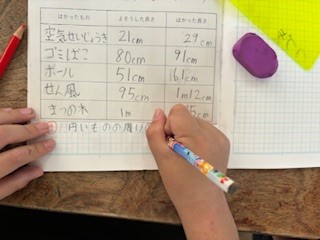 校庭の松の木やのぼり棒の周りの長さも測ってみました。