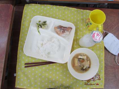 本日の給食の献立をご紹介します。本日の献立は、ご飯、あかうおのしょうゆだれかけ、みそ汁、大阪しろなの炒めもの、牛乳でした。