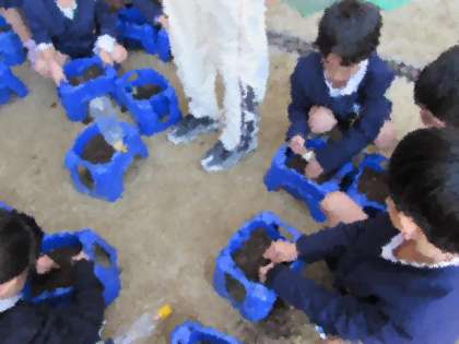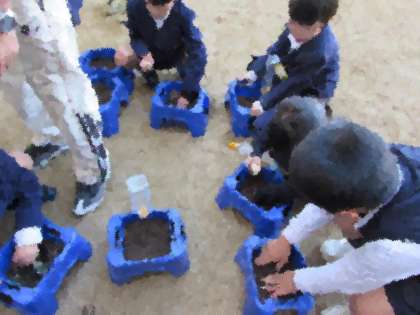 1年生が、1学期にアサガオを育てた鉢に、今日はチューリップの球根を植えました。春に、子どもたちが2年生になるころ、たくさんきれいな花を咲かせてくれることと思います。