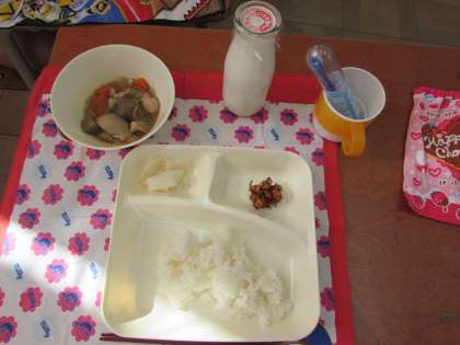 本日の給食の献立をご紹介します。本日の献立は、ご飯、鶏肉と野菜の煮物、じゃこ豆、かぶのゆず風味、牛乳でした。