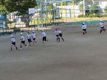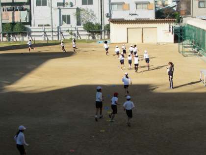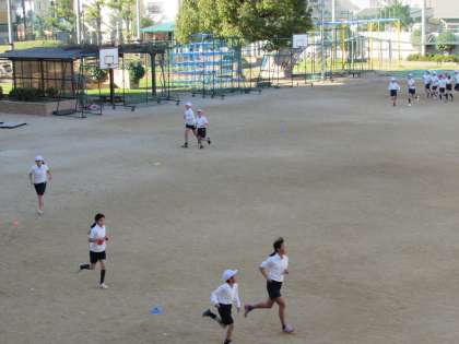 5年生の学習の様子をご紹介します。5年生が5時間目、運動場で体育をしています。今日は、持久走に取り組んでいます。できるだけ同じペースで走ることが目標です。